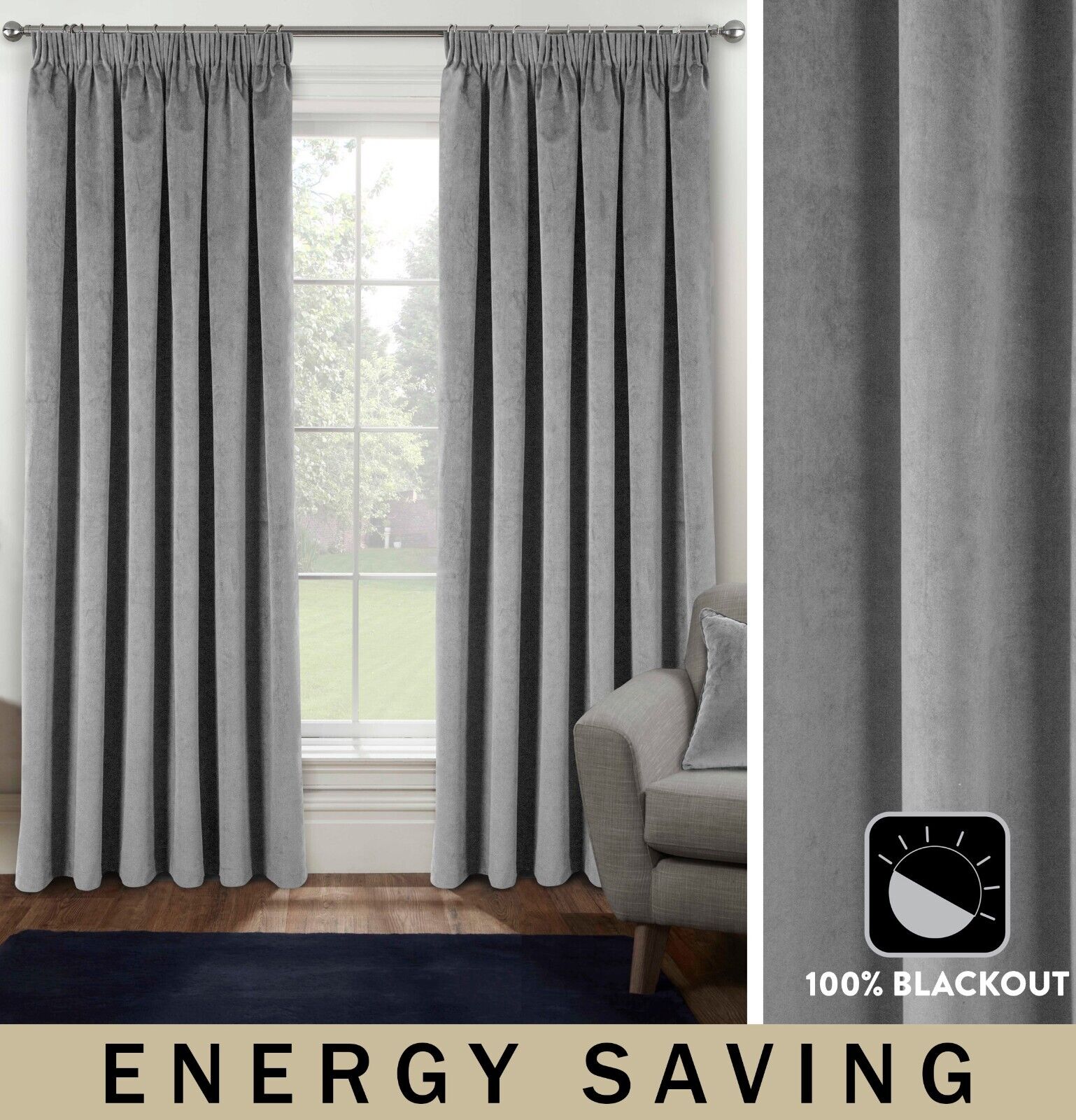 Grey Velvet 100% Blackout Pair of Curtains Tape Top - 90 x 90 inch (229x229cm)