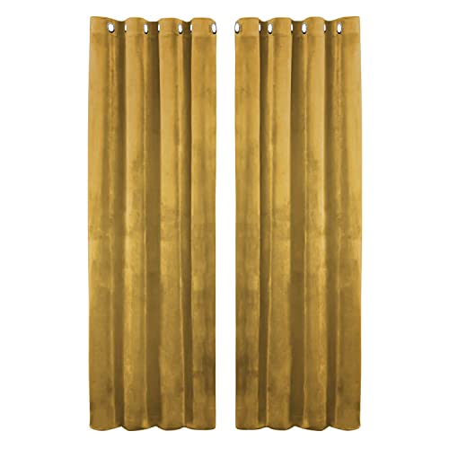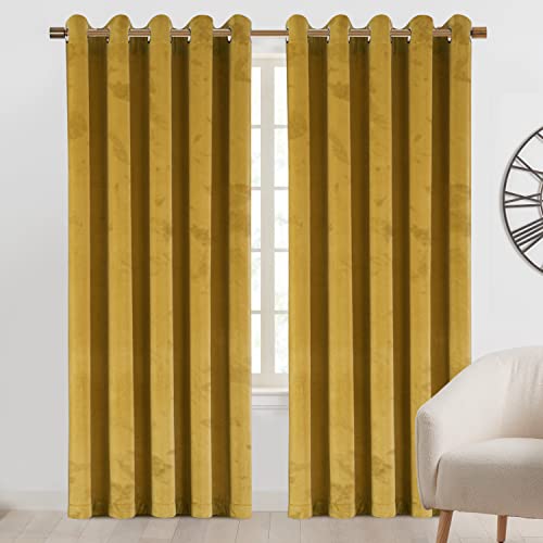 Hafaa Ochre Blackout Curtains for Bedroom – 90x90 Crushed Velvet Curtains for Living Room – Eyelet Room Darkening Curtains with 2 Tie Backs – (228cm x 228cm)