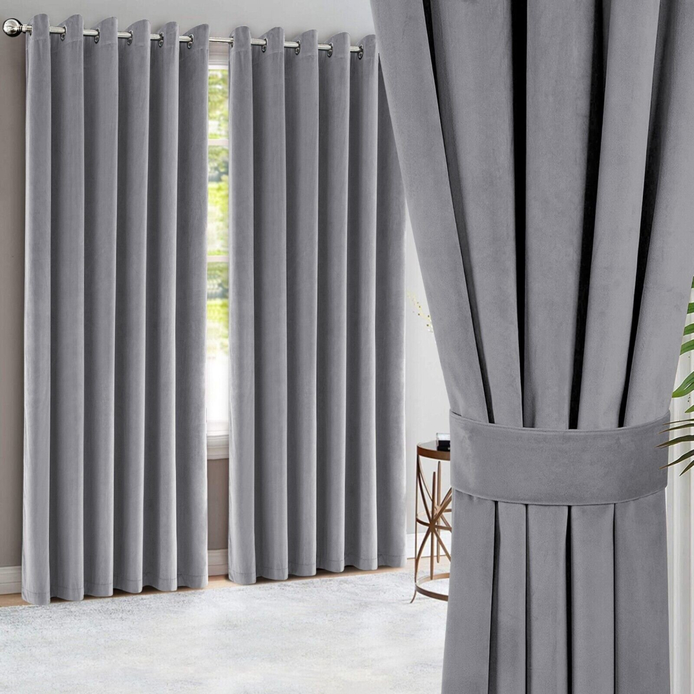 (Grey, 90"x90") Moonlight Bedding Crushed Velvet Blackout Curtains Thermal Insulated Pair OF Ready Made Curtain Panel + 2 Tie Backs f
