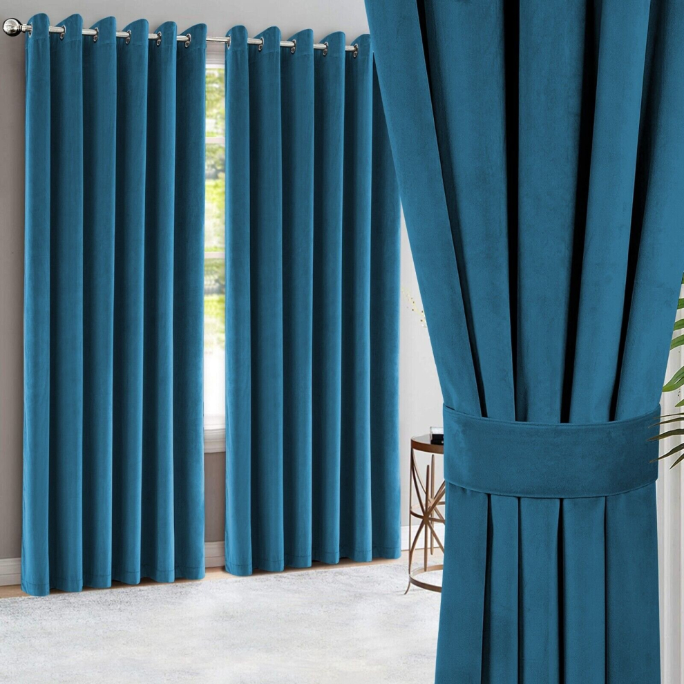 (90x90", Blue) Solid Eyelet Curtains Blackout Fully Lined Ready Made Velvet Ring Top Casa