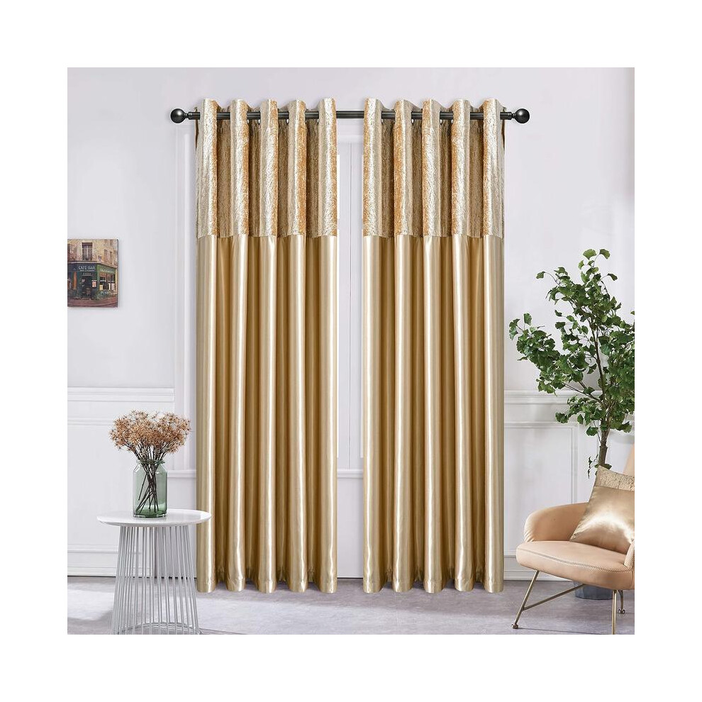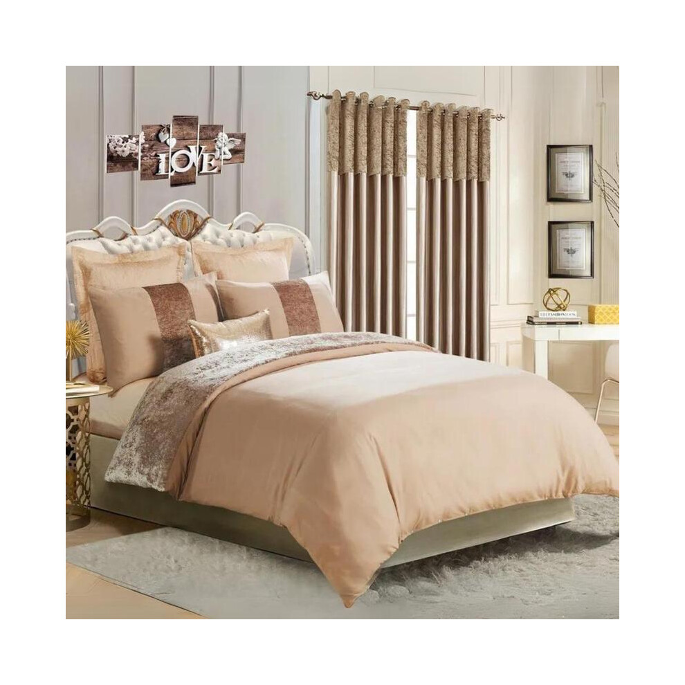 (CHAMPAGNE GOLD, Matching Curtain-90X90) Luxurious Crushed Velvet Duvet Set with Matching Faux Silk Eyelet Curtains - Available in Multiple Sizes