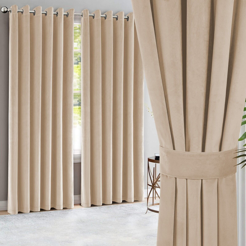 Oxford Homeware Beige Blackout Curtains 90x90 for Bedroom – Crushed Velvet Eyelet Curtains Thermal Insulated + 2 Tie Backs (228cm x 228cm)