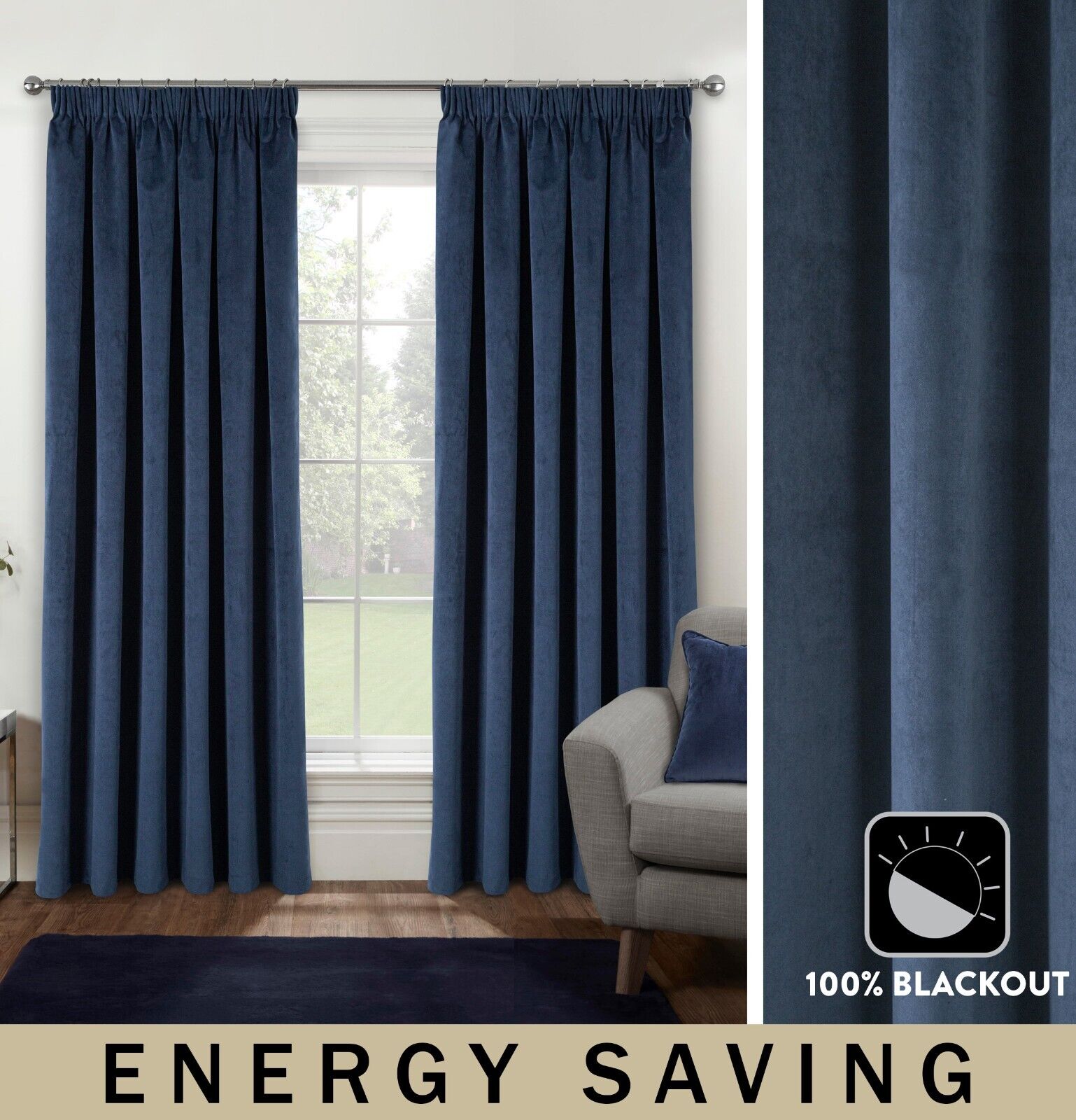 Navy Velvet 100% Blackout Pair of Curtains Tape Top - 90 x 90 inch (229x229cm)