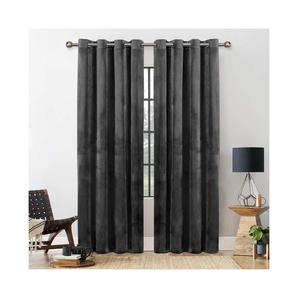 (CHARCOAL, 90X90) THICK VELVET CURTAINS PAIR OF EYELET RING TOP SOFT