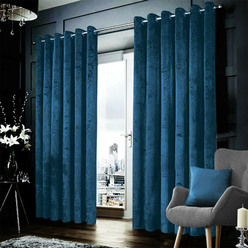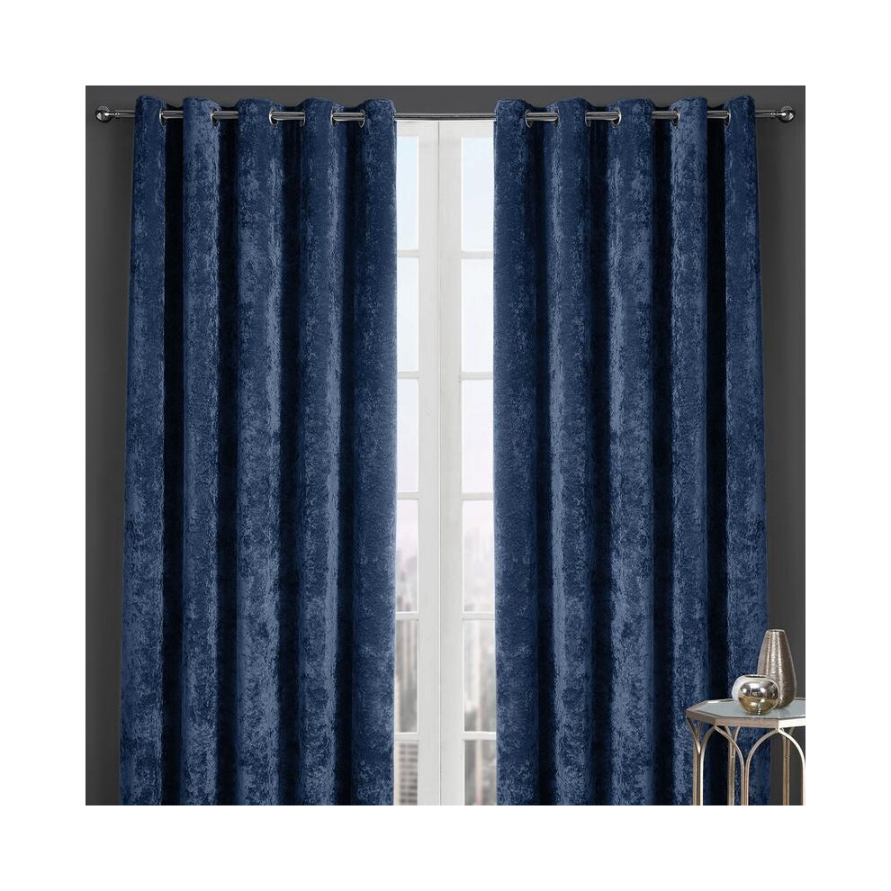 (Navy, 90x90) New Crushed Velvet Curtains Pair Ready Made Fully Lined Eyelet Ring Top Pair