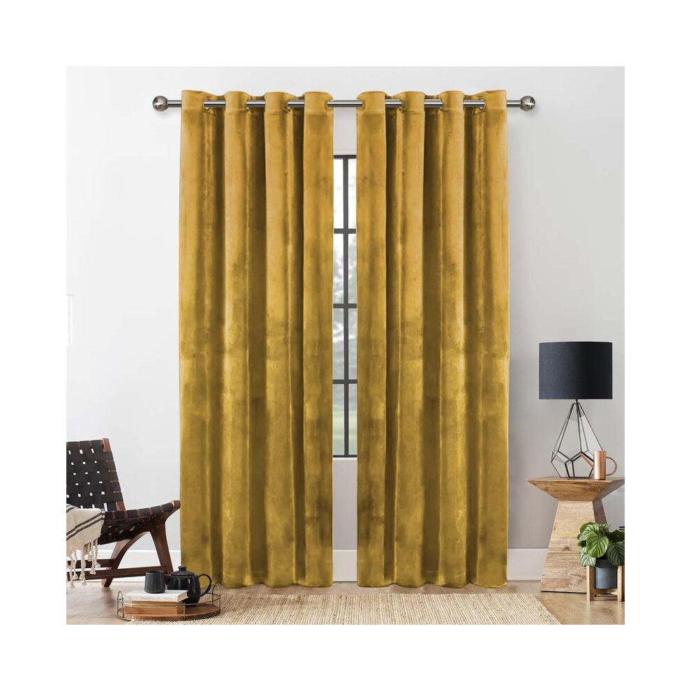 Oxford Homeware Ochre Blackout Curtains 90x90 for Bedroom – Crushed Velvet Eyelet Curtains Thermal Insulated + 2 Tie Backs (228cm x 228cm)