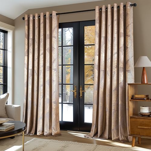 MIULEE Velvet Curtains with Gold Foil Leaves Pattern, 2 Beige Velvet Curtains with Eyelets, Each 90 x 90 Inch, Room Darkening Drapes for Classical Living Room Bedroom