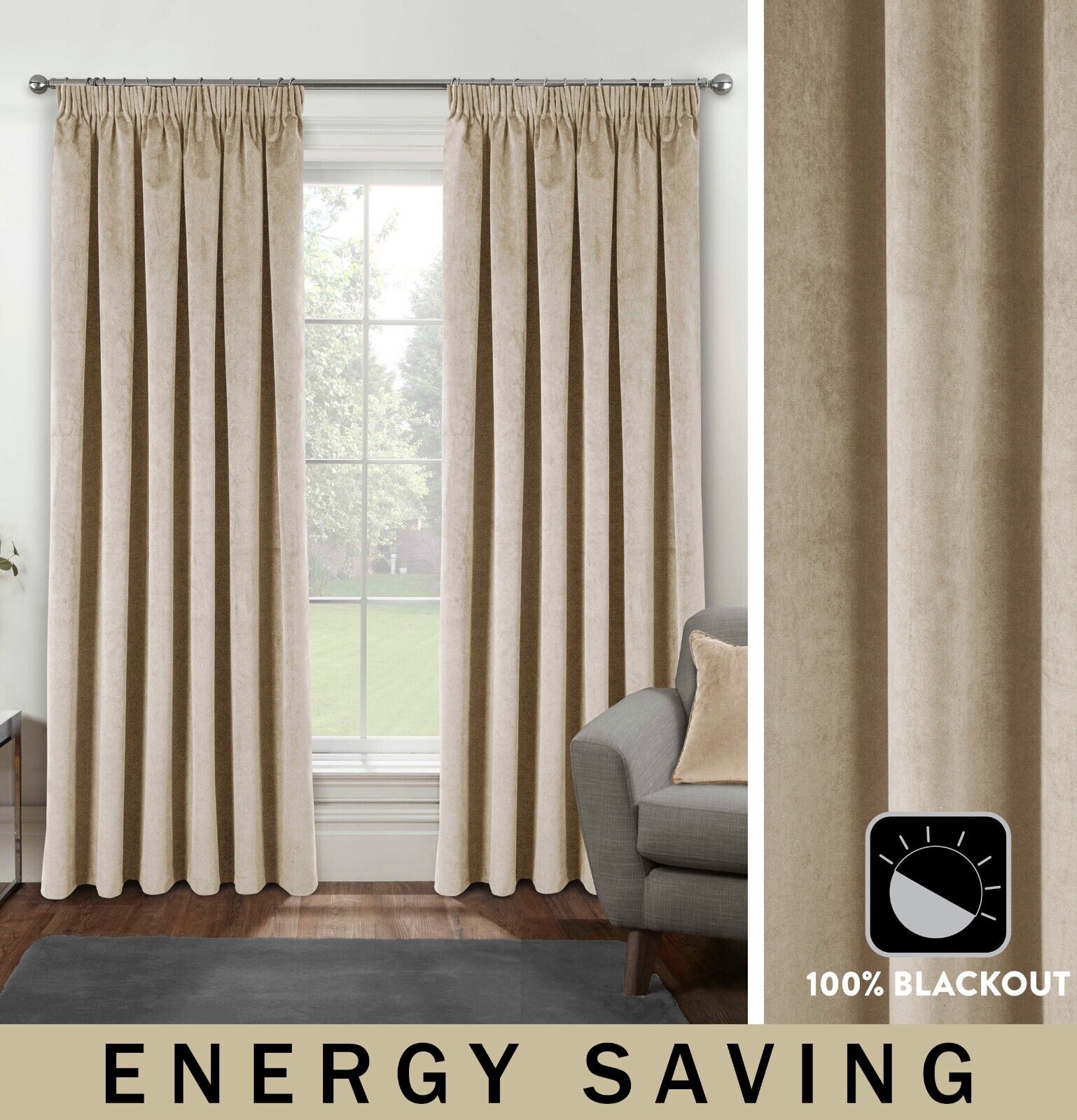 Sun Block Out Curtains Cosy Thermal Lined Velvet Eyelet 90x90" Natural Colour