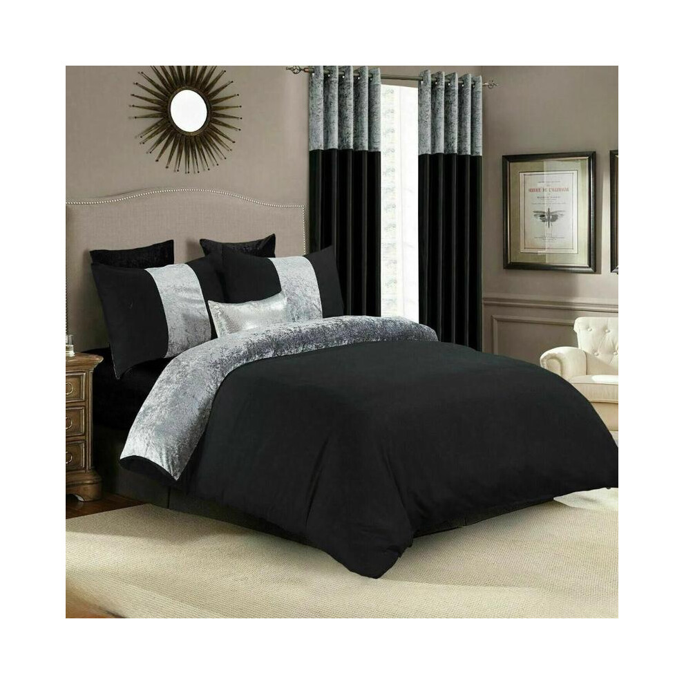 (BLACK SILVER, Matching Curtain-90X90) Luxurious Crushed Velvet Duvet Set with Matching Faux Silk Eyelet Curtains - Available in Multiple Sizes