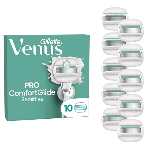 Gillette Venus Pro ComfortGlide Sensitive Women’s Blades with a Touch of Aloe, 10 Refill Blades Cartridges, Reusable Metal Handle and Shower Holder