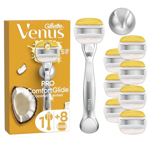 Gillette Venus Razor, PRO ComfortGlide Coconut Scented with Olay 5 Blade Women's Razor + 8 Razor Blades + Shower Hook