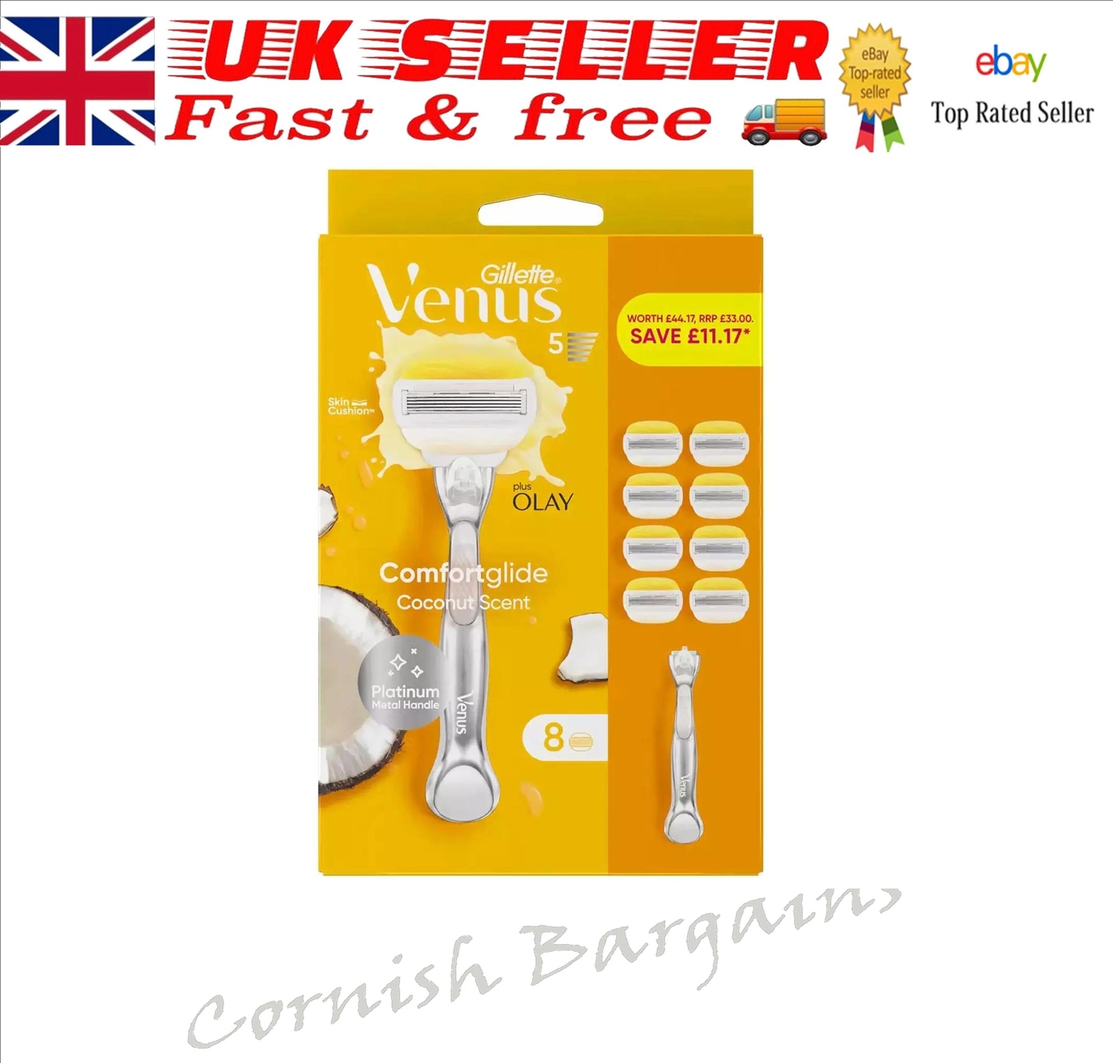 Gillette Venus Pro ComfortGlide Coconut with Olay Platinum Razor 8 Razor Blades & Shower Hanger