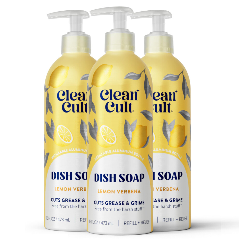 Cleancult - Lemon Verbena - Liquid Dish Soap - Refillable Aluminum Bottle - Dish Soap that Cuts Grease & Grime - 16 oz - 3 Pack