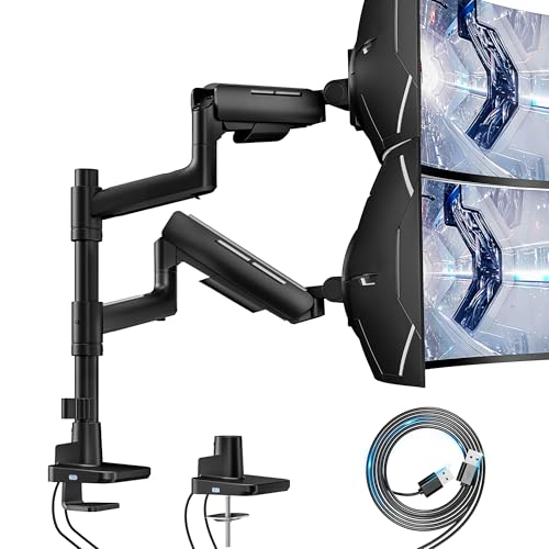 ARES WING Vertical Dual Monitor Mount for 17-49 Inch Ultrawide Heavy Duty Curved Screen Stacking, Computer Monitor Arm Desk Mount with USB, Gas Spring Adjustable Vesa Stand, Black