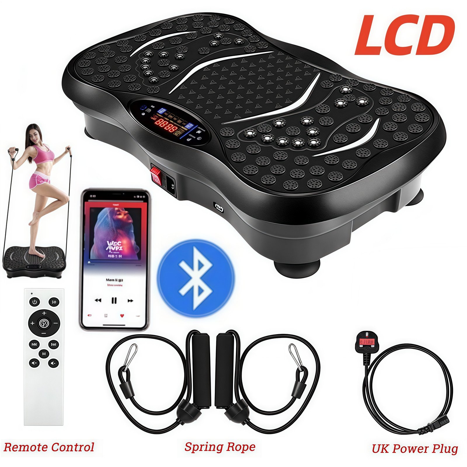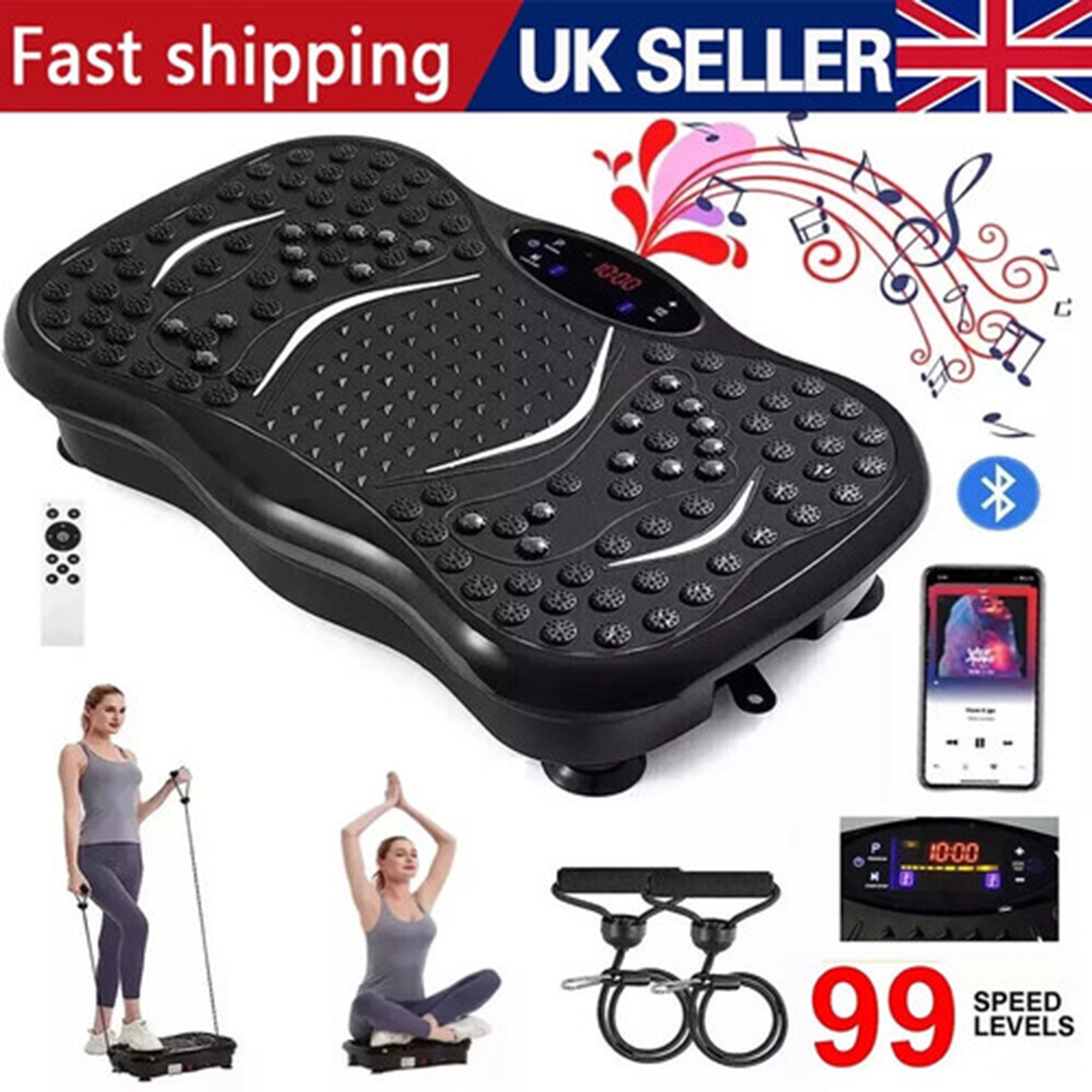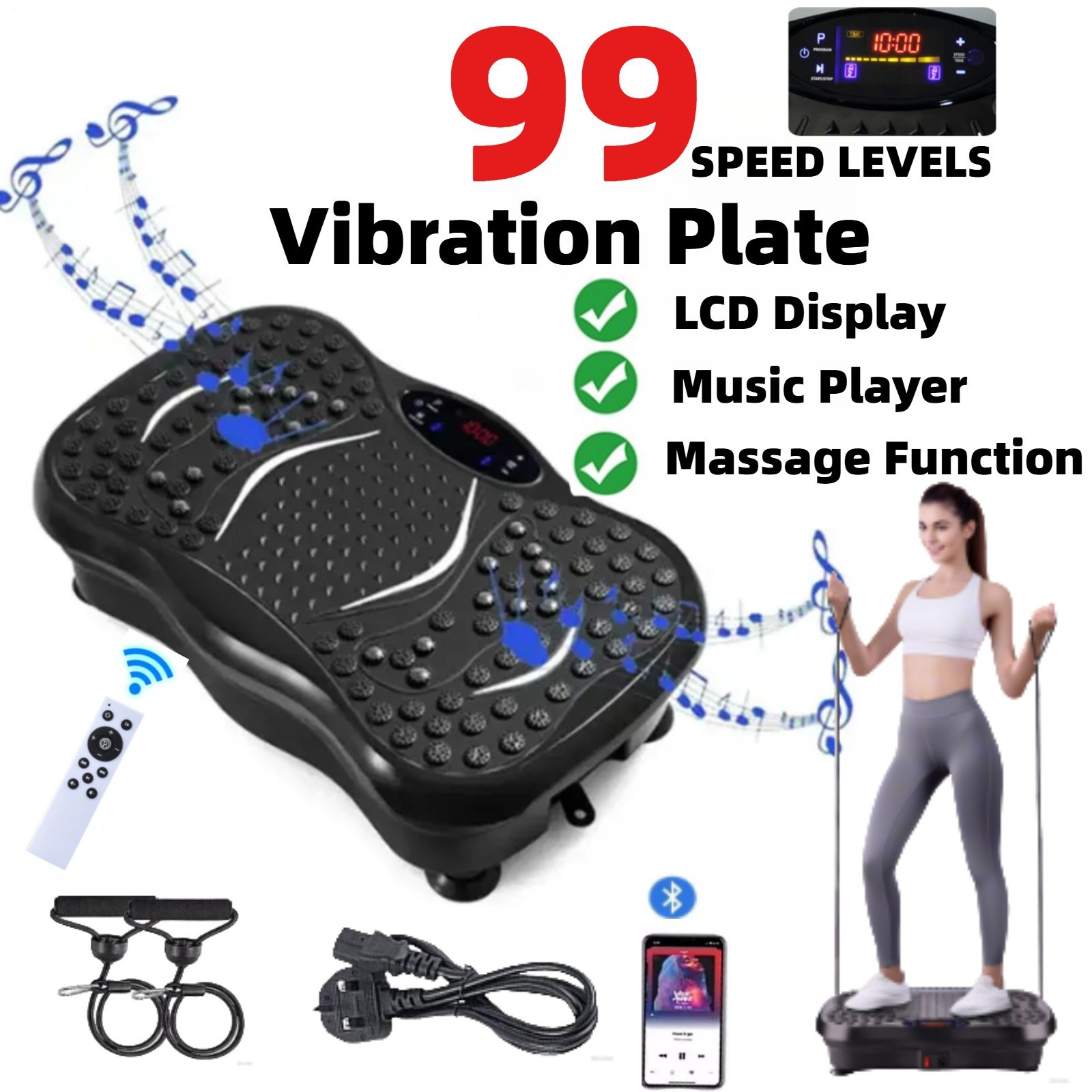 TOTEBOX Vibration Plate Platform with Resistance Bands, Power Vibration Fitness Trainers Bluetooth for Whole Body Workout 99 Levels Black w/ Remote