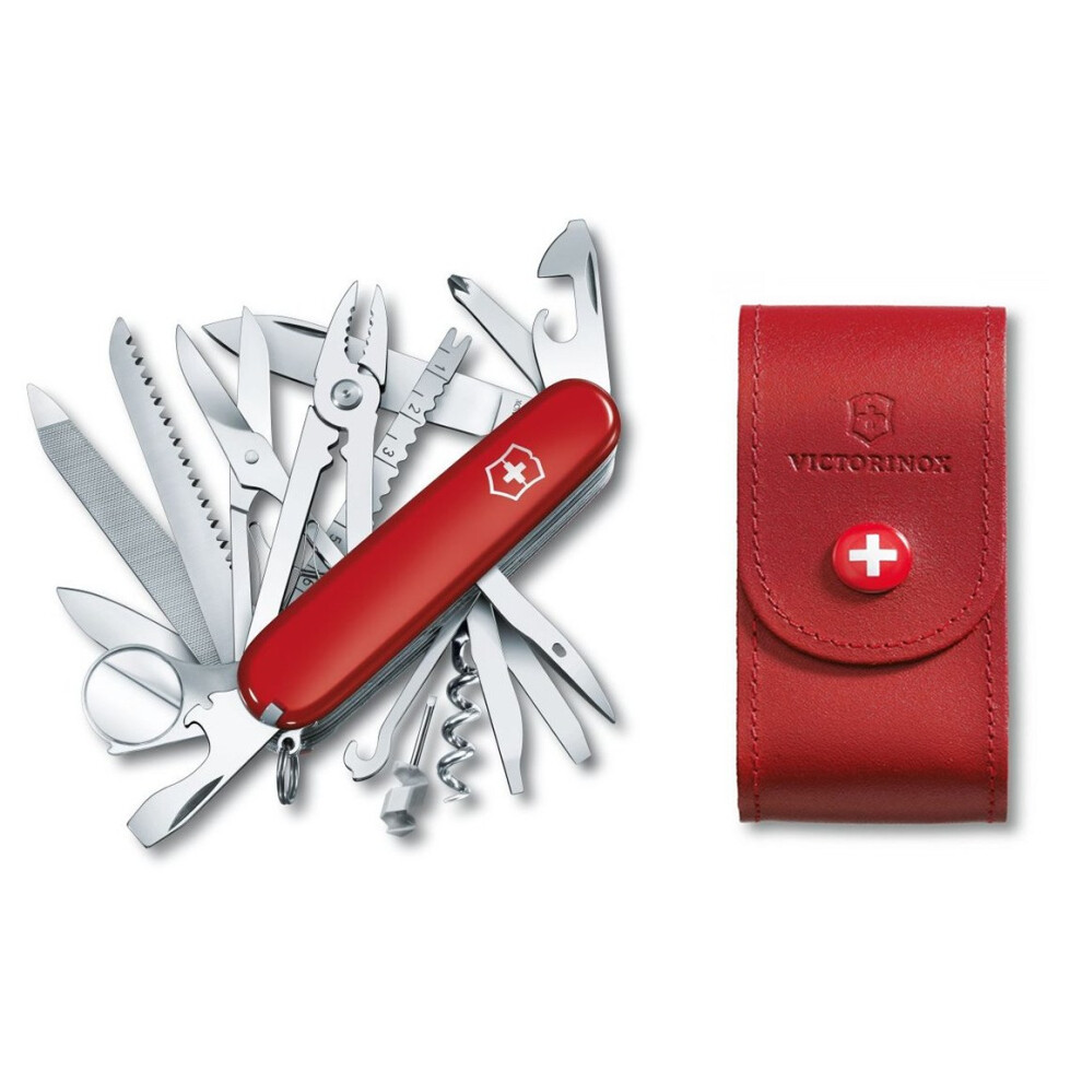 Victorinox Swiss Champ Swiss Army Knife, Medium, Multi Tool, 33 Functions, Blade, Scissors, Red & Leather Pouch for Swiss Army Pocket Knives, 3,5cm x 10cm, Black, L