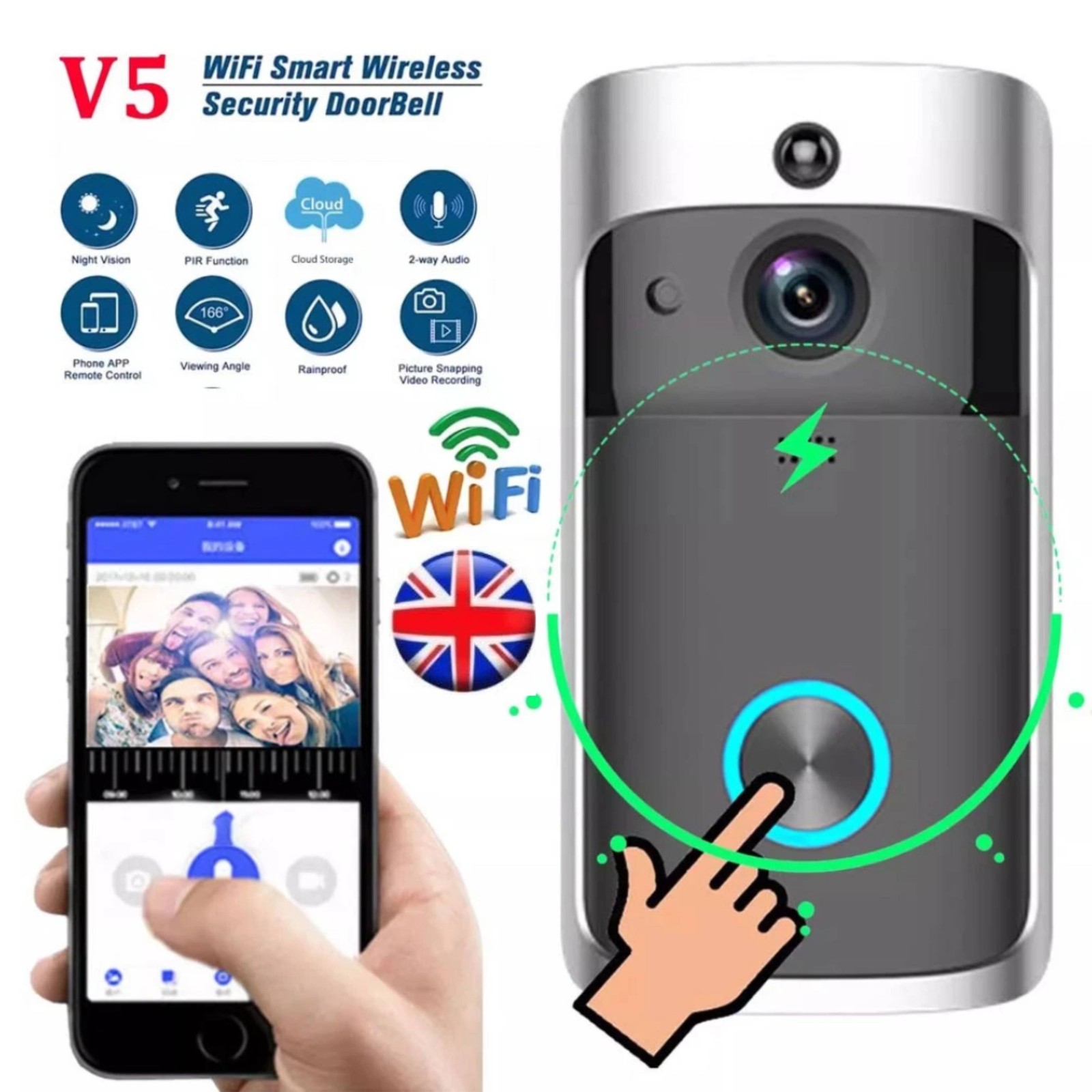 Slim Wireless Video Door Bell 5200mah battery, including UK Chime