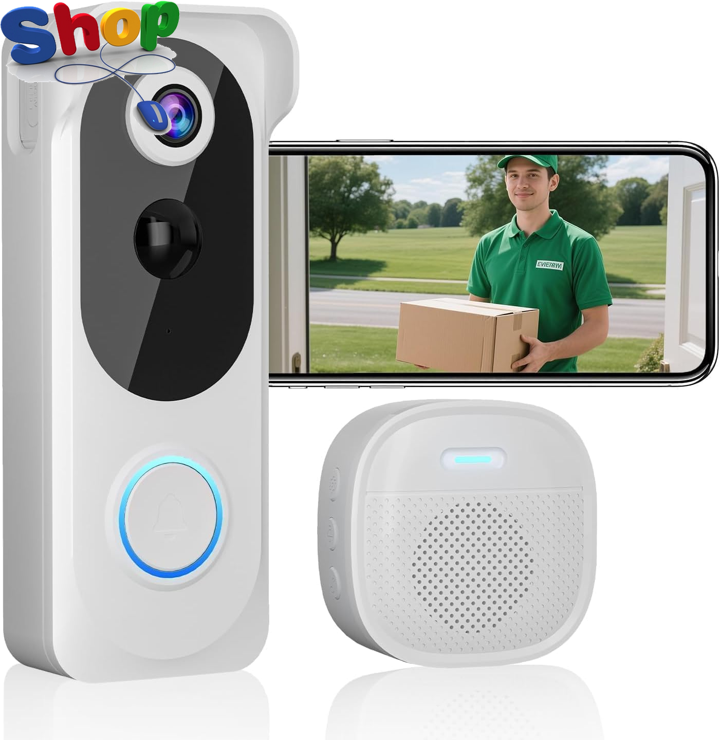 Wireless Video Doorbell with Chime, 2K HD No Subscription Security Doorbell Camera, PIR Motion Detection, Night Vision, 2-Way Audio, Battery Powered, SD Card/Cloud Storage, Works with Alexa and Google
