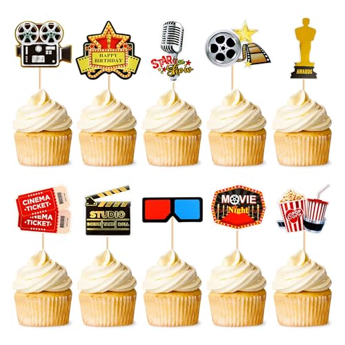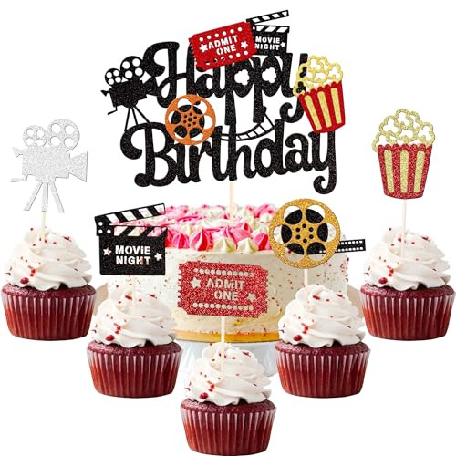 SYKYCTCY 31 Pack Movie Cupcake Toppers Happy Birthday Sign Cake Pick Decorations for Theater Video Recorder Roll Camera Popcorn Hollywood Theme Family Film Baby Shower Birthday Party Supplies