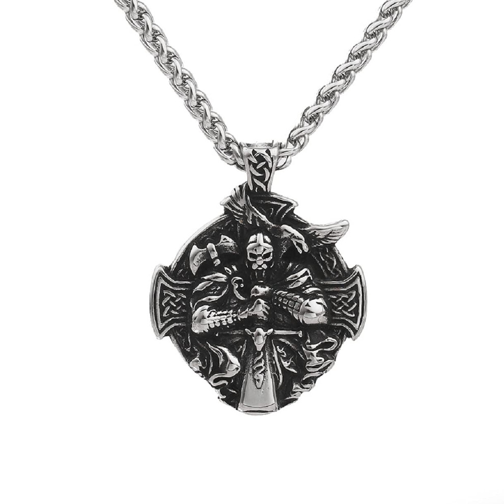 MayiaHey Nordic Viking Odin Raven Cross Rune Necklace for Men, Vintage Odin Raven Sword Necklace Viking Warrior Eagle Axe Hammer Necklace (Silver)
