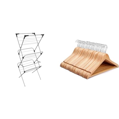 Vileda Sprint 3-Tier Clothes Airer, Indoor Clothes Drying Rack with 15 m Washing Line, Silver & KEPLIN Strong Natural Wood Wooden Coat Hangers with 360 Degree Rotatory Hook & Round Trouser Bar