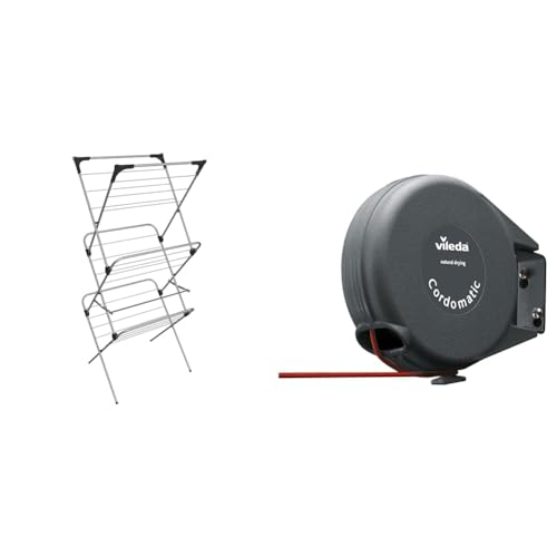 Vileda Sprint 3-Tier Clothes Airer, Indoor Clothes Drying Rack with 15 m Washing Line, Silver & Cordomatic Retractable Washing Line with 15m Outdoor Clothes Line