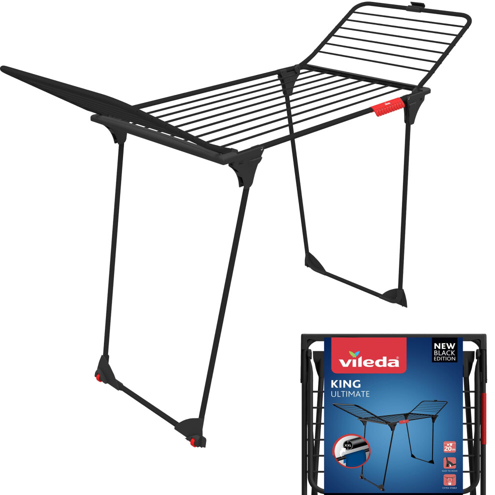 Vileda King Ultimate Black Indoor Clothes Airer - XXL lines for fewer creases - 20M Drying Length with Sock Hanger, Wheels for Easy Transport - Suitable for both Indoor and Outdoor Drying