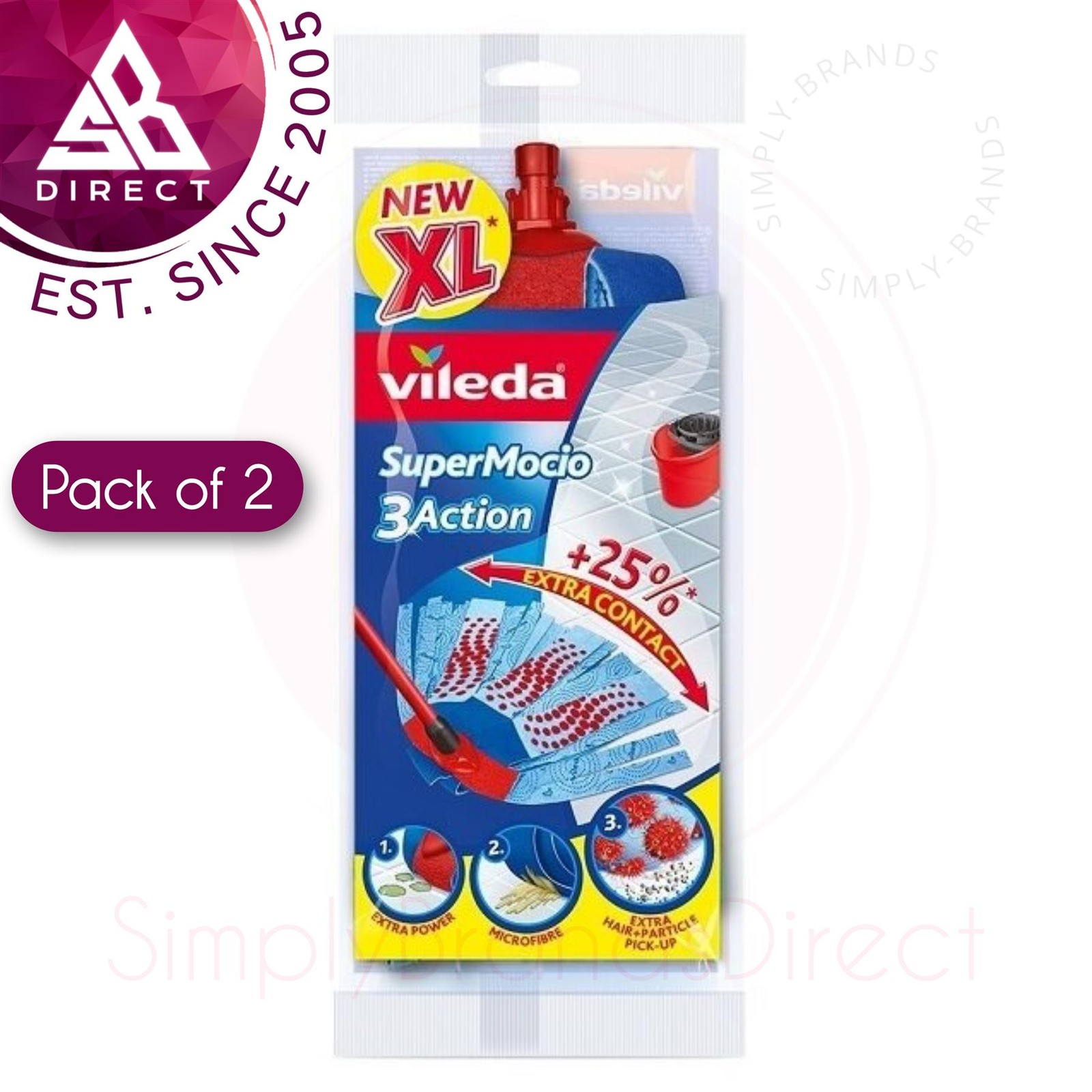 Vileda SuperMocio 3Action XL Mop Refill - Pack of 2 - Fits all SuperMocio Mops- Authentic Vileda Mop Head Replacement - Machine Washable - Advanced M