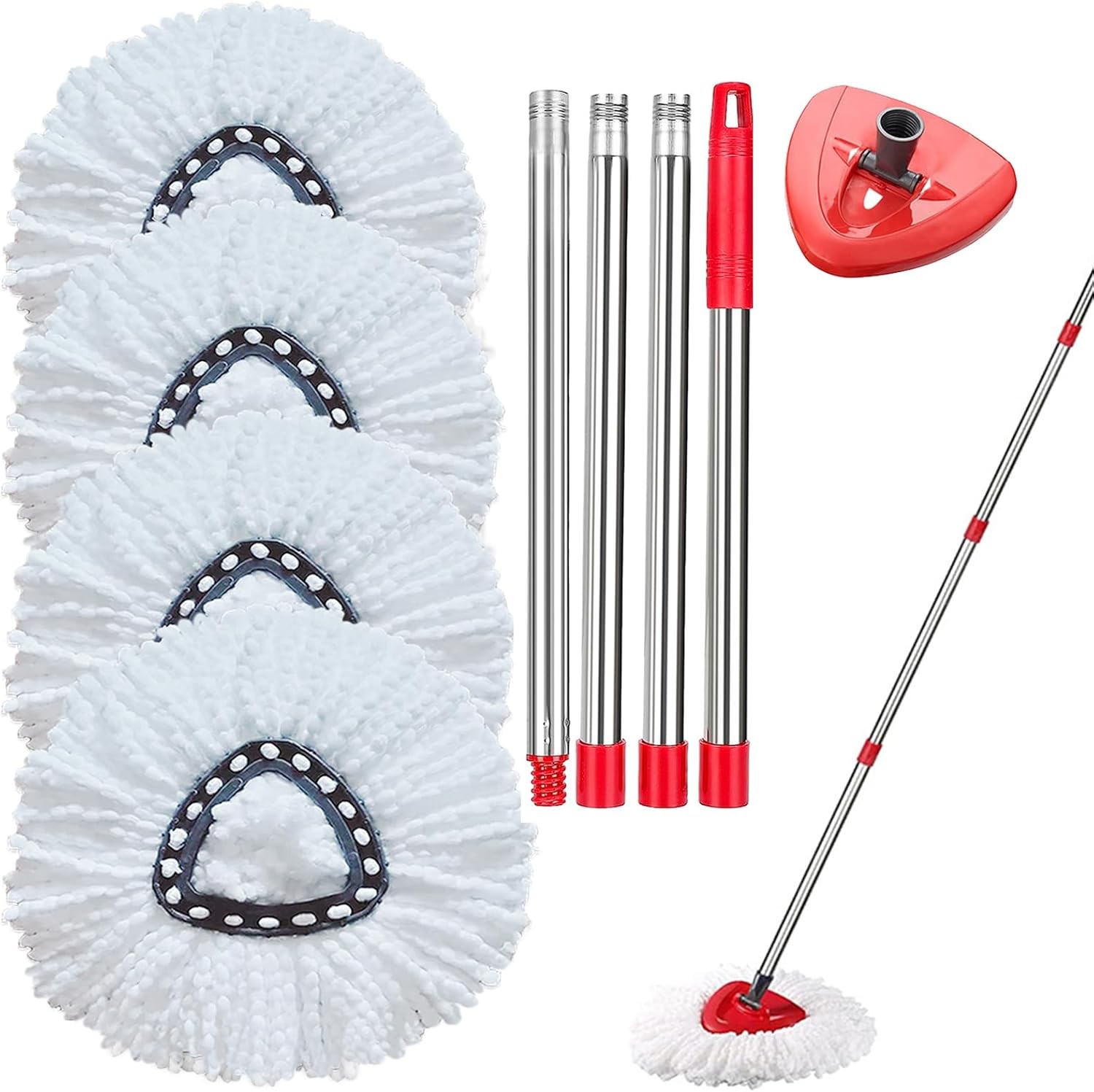 PIMEKOY Spin Mop Head Replacement, Base, Handle Compatible with Vileda Turbo Microfibre Mop, 4 Microfiber Heads, 1 Triangle Cover and 76-148cm Handle Combo Set