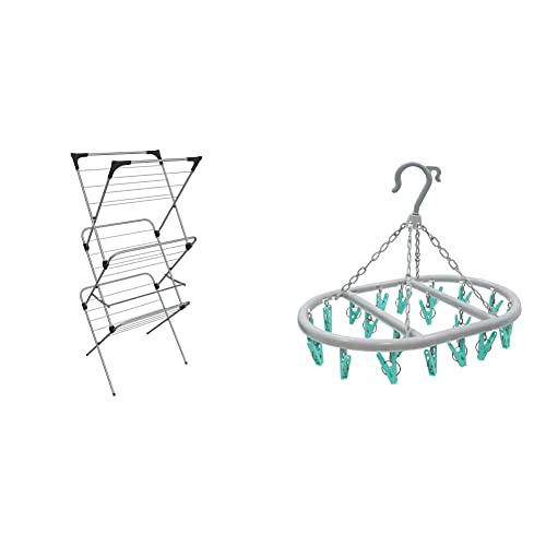 Vileda Sprint 3-Tier Clothes Airer, Indoor Clothes Drying Rack with 15 m Washing Line & JVL Oval Sock Dryer Complete with 20-Piece Clothes Pegs, Aqua, Grey, White, One Size, 19-293