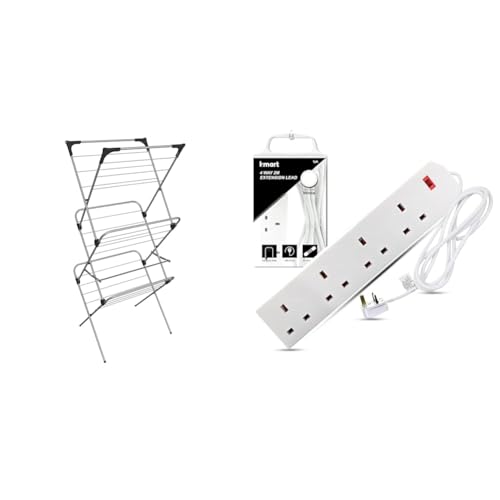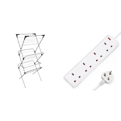Vileda Sprint 3-Tier Clothes Airer, Indoor Clothes Drying Rack with 20 m Washing Line, Silver & Heavy Duty Extension Lead UK Pin Plug and Cable, 4 Gang Way 2m Power Adapter