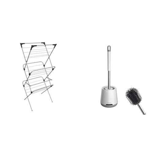 Vileda Sprint 3-Tier Clothes Airer, Indoor Clothes Drying Rack with 15 m Washing Line, Silver & Ibergrif M34152 Silicone Toilet Brushes & Holders, Toilet Brush with Quick Drying Holder Set