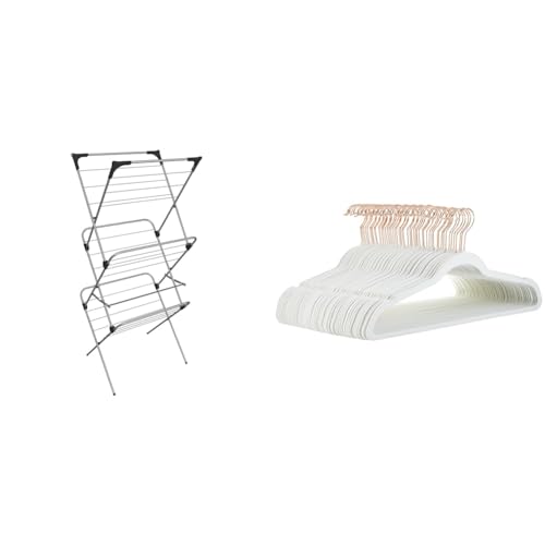 Vileda Sprint 3-Tier Clothes Airer, Indoor Clothes Drying Rack with 20 m Washing Line, Silver & Amazon Basics Slim Velvet Non-Slip Suit Hangers, Ivory/Rose Gold - 50-Pack