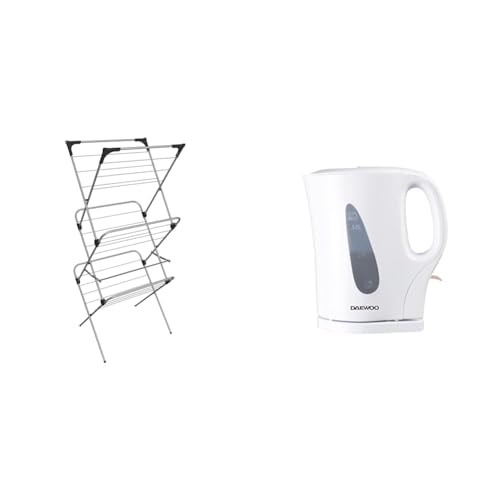 Vileda Sprint 3-Tier Clothes Airer, Indoor Clothes Drying Rack with 20 m Washing Line, Silver & Daewoo Essentials, Plastic Kettle, White, 1.7 Litre Capacity, Fill 7 Cups, Family Size