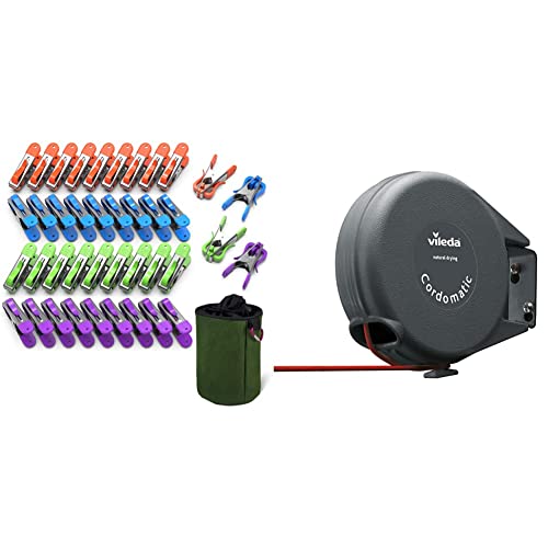VOUNOT 40 Strong Stainless Steel Multicolour Laundry Pegs with Soft Grip, Hooks & Silicone Protection & Vileda Cordomatic Retractable Washing Line (15m, Red, Holds 15kg) for Home & Kitchen