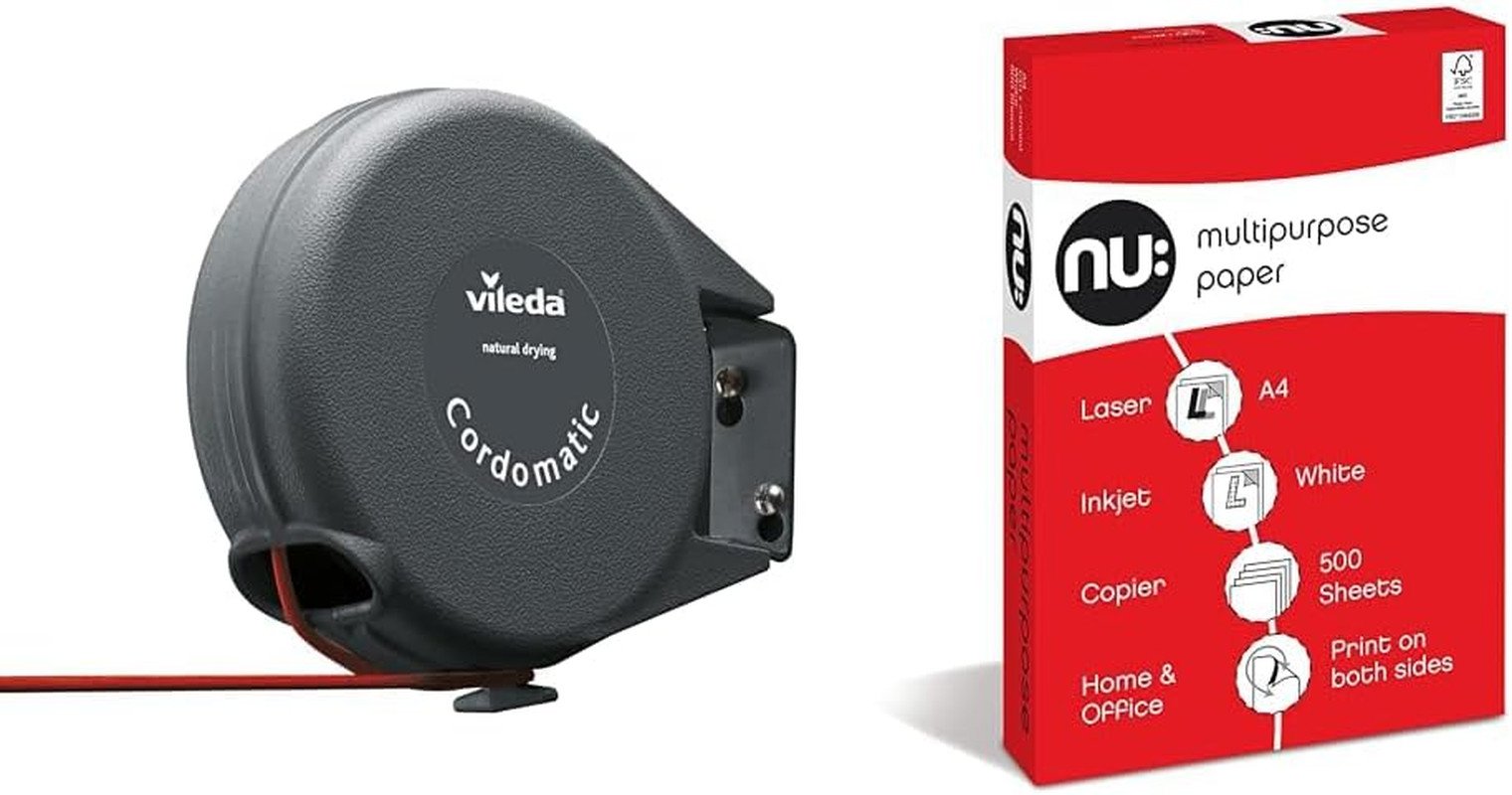 Vileda Cordomatic Retractable Washing Line with 15m Outdoor Clothes Line & NU: Multi-Purpose Printer Paper, White, 500 Sheets