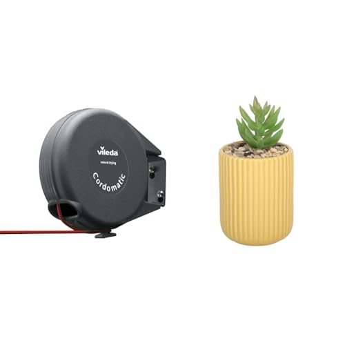 Vileda Cordomatic Retractable Washing Line with 15m Outdoor Clothes Line & Sleepdown Halo Green Leaf Ochre Textured Pot Artificial Faux Plant for Home Office Bathroom Décor