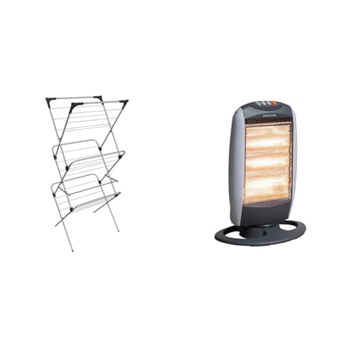 Vileda Sprint 3-Tier Clothes Airer, Indoor Clothes Drying Rack with 15 m Washing Line, Silver & Daewoo Oscillating Halogen Heater With Tip Over Cut-Out, 3 Heat Settings, and Instant Heat Glow