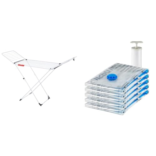 Vileda Extra X-Legs Clothes Airer, Indoor Clothes Drying Rack with 20m Washing Line, White & Amazon Basics Vacuum Compression Zipper Storage Bags with Airtight Valve and Hand Pump