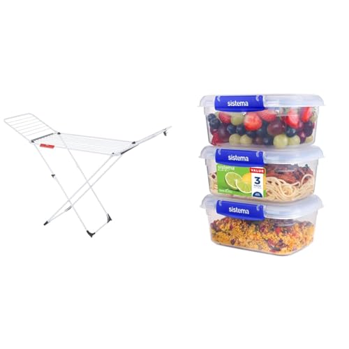 Vileda Extra X-Legs Clothes Airer, Indoor Clothes Drying Rack with 20m Washing Line, White & Sistema KLIP IT PLUS Food Storage Containers | 1 L | Leak-Proof, Stackable & Airtight Fridge/Freezer