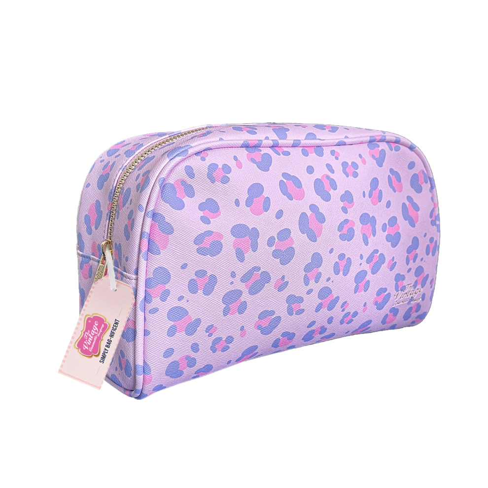 The Vintage Cosmetic Company Large Oval Bag, Fresh and Light Cosmetic Bag for Make up Storage, Lilac Leopard Print Design