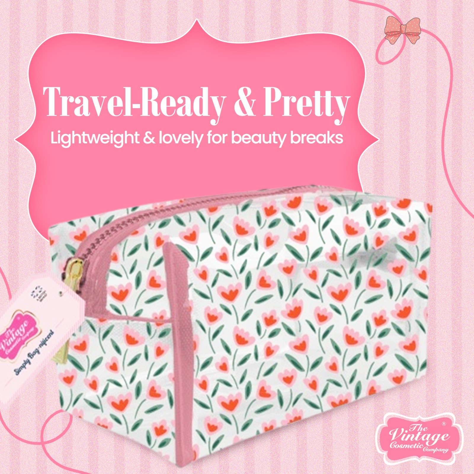 The Vintage Cosmetic Company Tulip Square Carry Bag, Floral Cosmetic Organizer for Makeup, Toiletries, and Travel Essentials with Zipper Closure