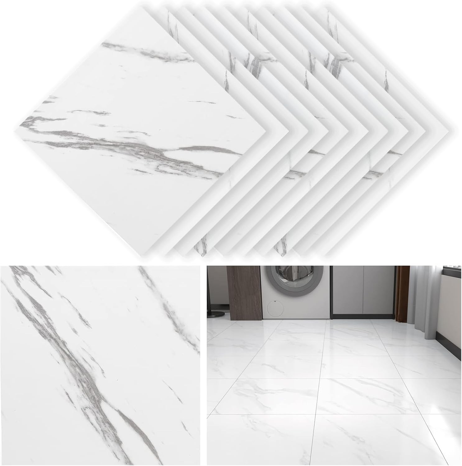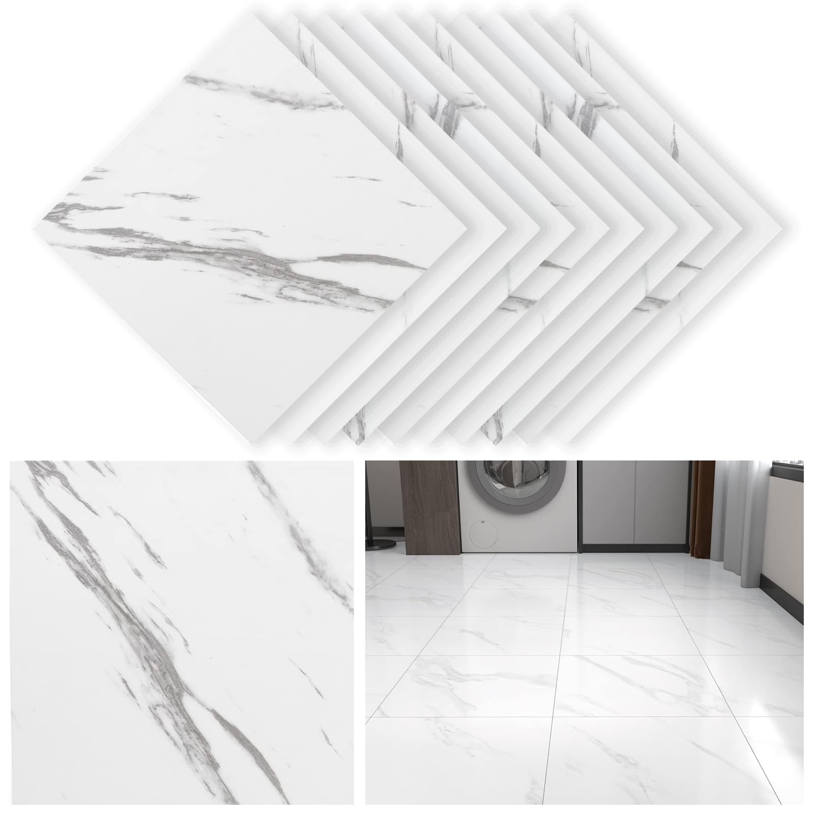 10 Sheets Vinyl Floor Tiles Self Adhesive Floor Sticker Kitchen Waterproof Marble White Vinyl Flooring Peel and Stick Floor Tile for Living Room 30x30cm