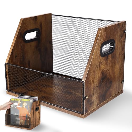 Bryzal Vinyl Record Storage Holder, Wood & Metal Holds up to 60 Records Vinyl Record Storage Crate with Handle, Album Storages Desktop Organizer Box for Vinyls Records Books Files