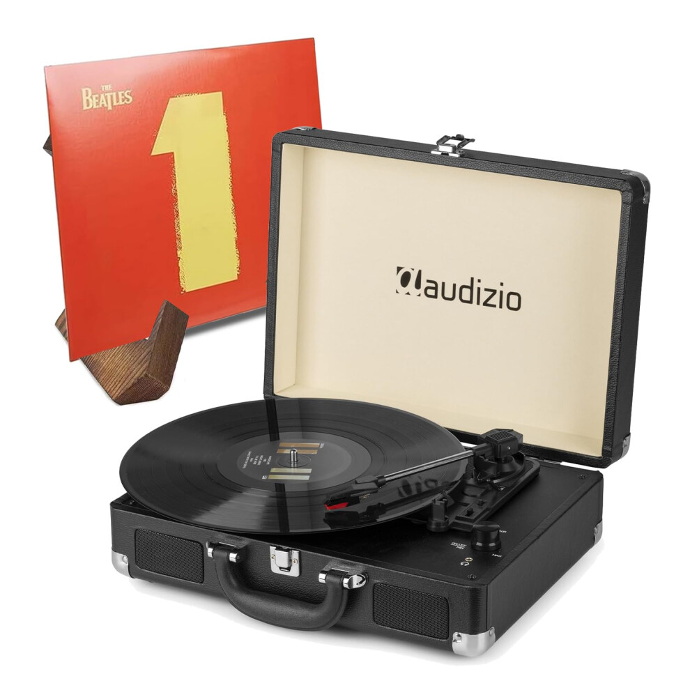 Audizio RP114BK Black Suitcase Vinyl Record Player with Built-in Speakers & Retro Wooden Vinyl Display Stand, Briefcase Turntable for Home Audio & Ret