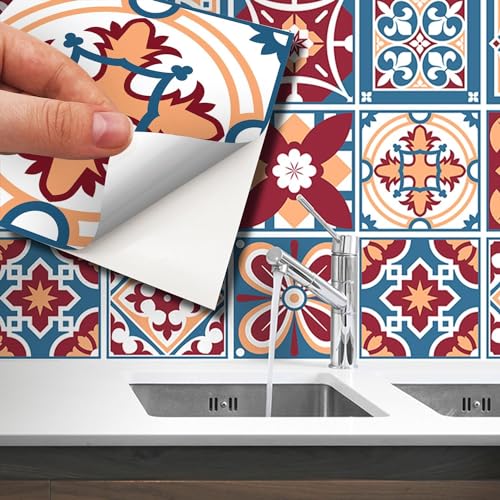 WALPLUS 96 pcs 15cm (6") Corfu Colourful Mediterranean Tile Stickers Peel and Stick Self-Adhesive Vinyl Wall Tiles for Kitchen Bathroom Bedroom Backsplash DIY Home Décor