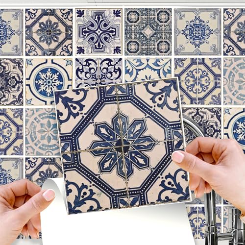 WALPLUS 72 pcs 15cm (6") Malaga Spanish Blue Tile Stickers Peel and Stick Self-Adhesive Vinyl Wall Tiles for Kitchen Bathroom Bedroom Backsplash DIY Home Décor
