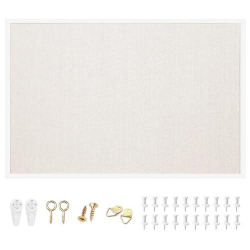 OWLKELA 90 x 60cm Linen Bulletin Board, White Framed Corkboard, White Oak Frame Linen Cork Board, Vision Board and Decorative Hanging Pin Board