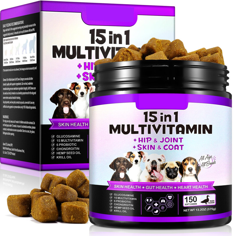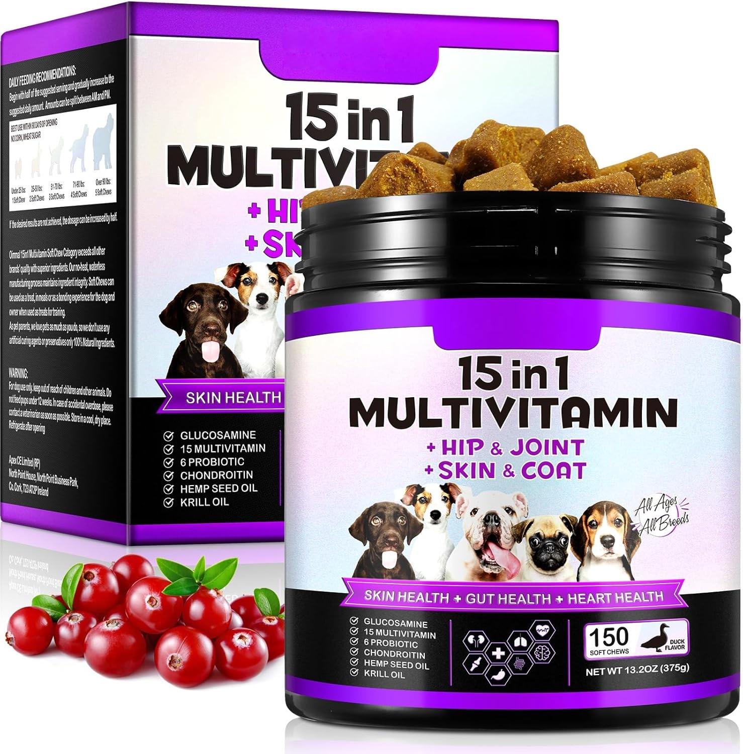 15 in 1 Dog Multivitamin Treats, 150 Chews Vitamins Supplements for Dogs, Hip & Joint Supplements, Immune System, Skin & Coat, Gut Health, Vitamins