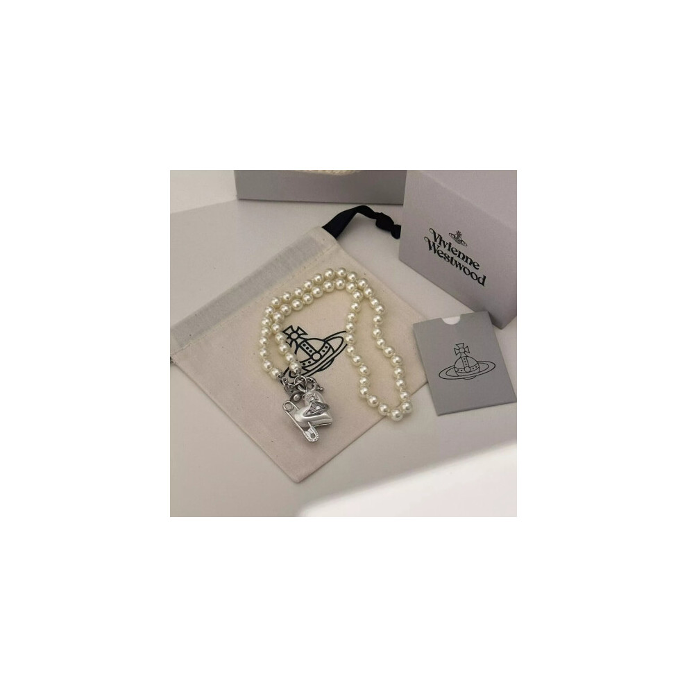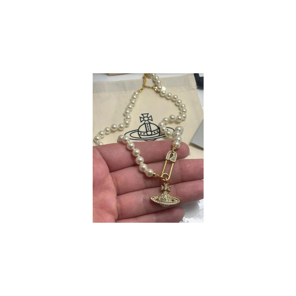 Vivienne Westwood White Pearl Safety Pin Clip Charm Gold Necklace Choker Chain